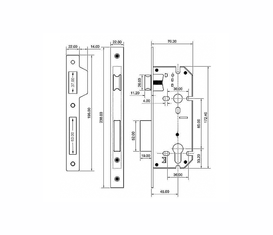 European style casing with 85mm centres which accommodates most euro profile cylinders
